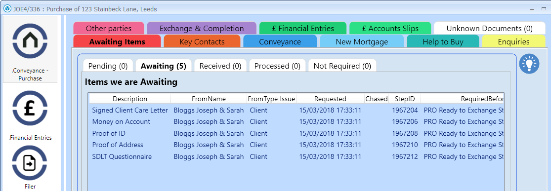 - Clear Matter summary view - displaying which Items we have received, and which Items we are still awaiting, with Request/Chase/Received dates