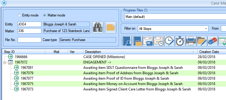 In this example we insert four generic waiting item steps, for a Client Care Letter, Money on Account, Proof of ID, Proof of Address, SDLT Questionnaire.